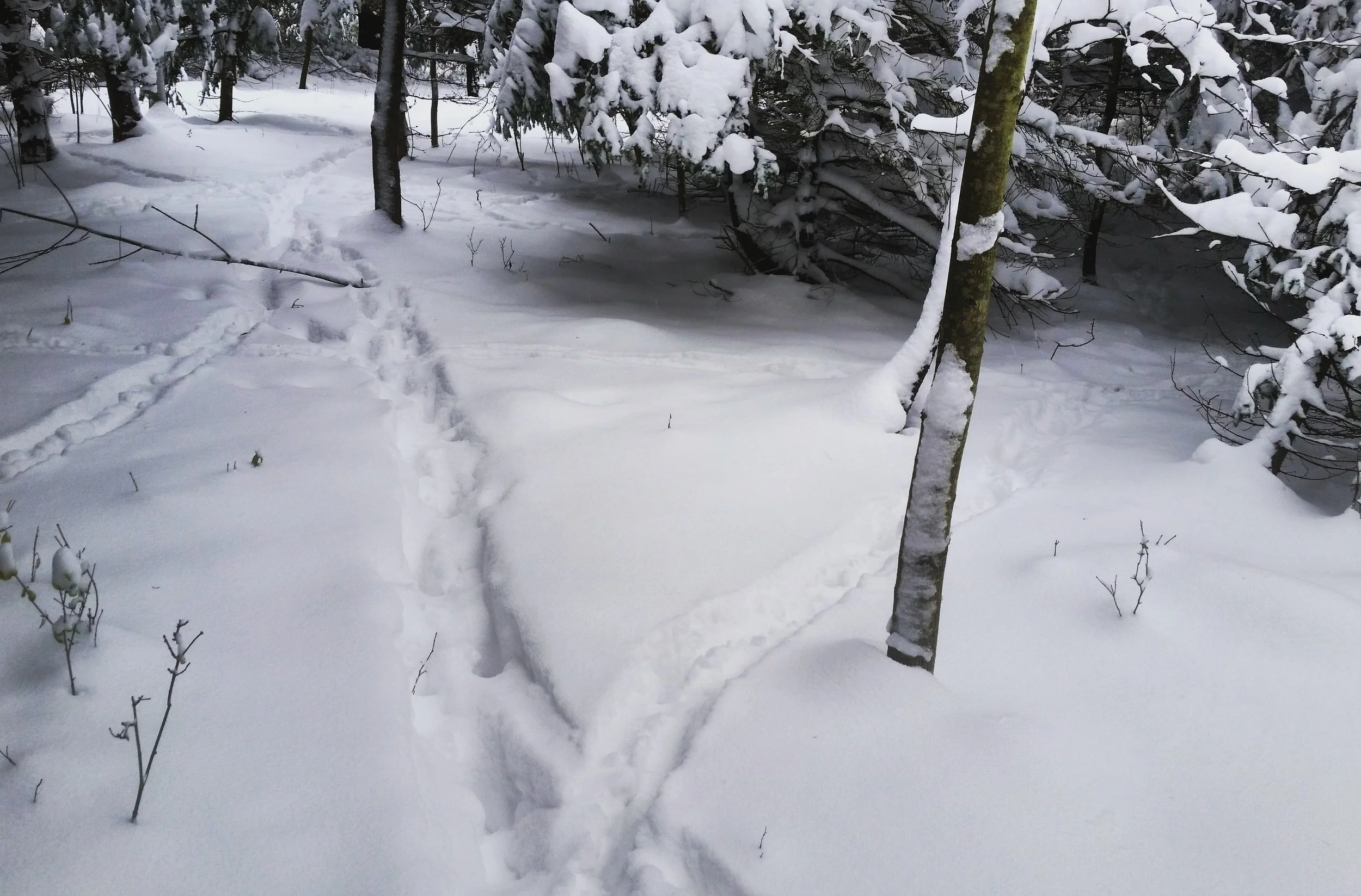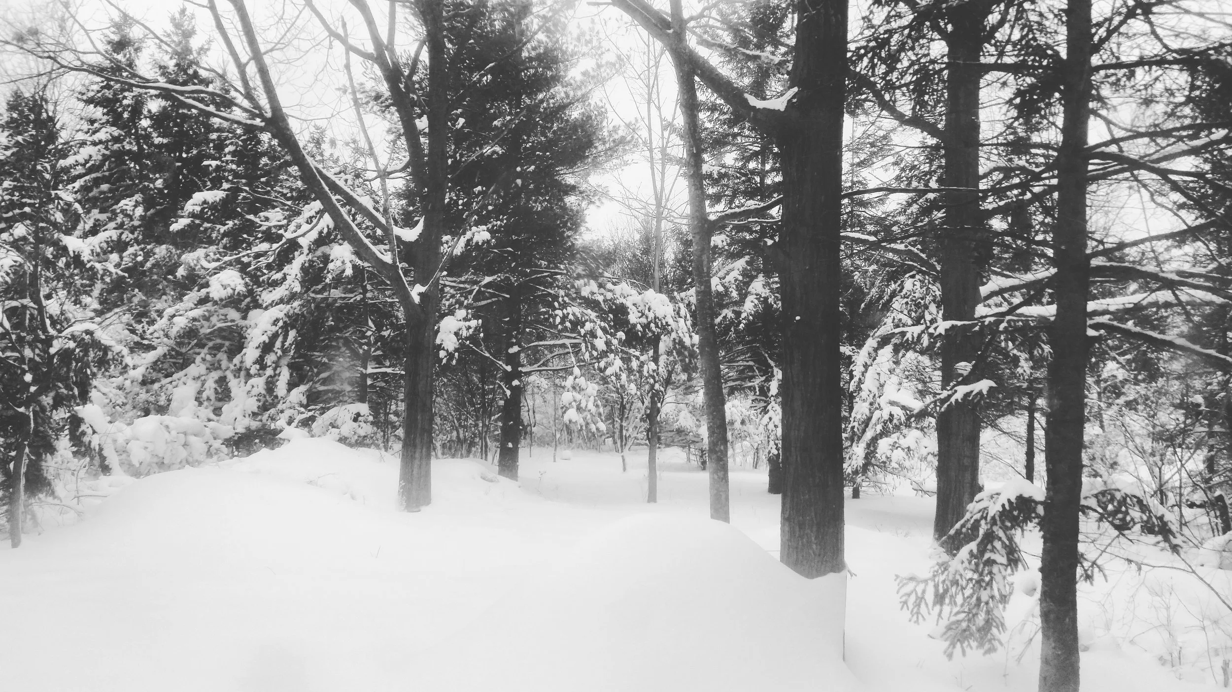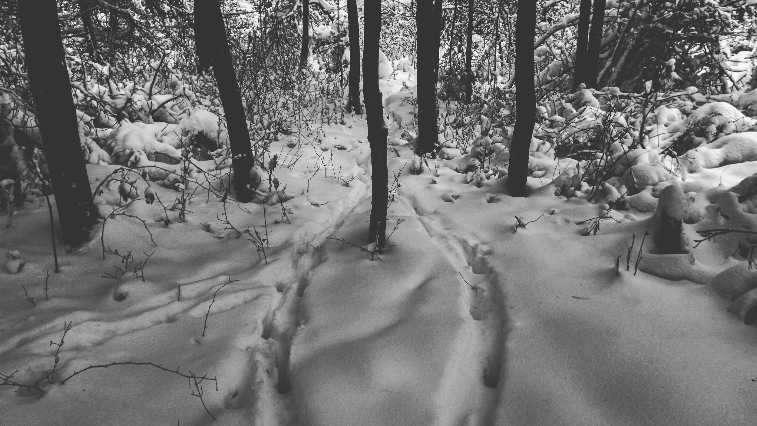 It's silent in the snow. Branches bow under the weight, making it seem like an entirely new and unfamiliar forest.