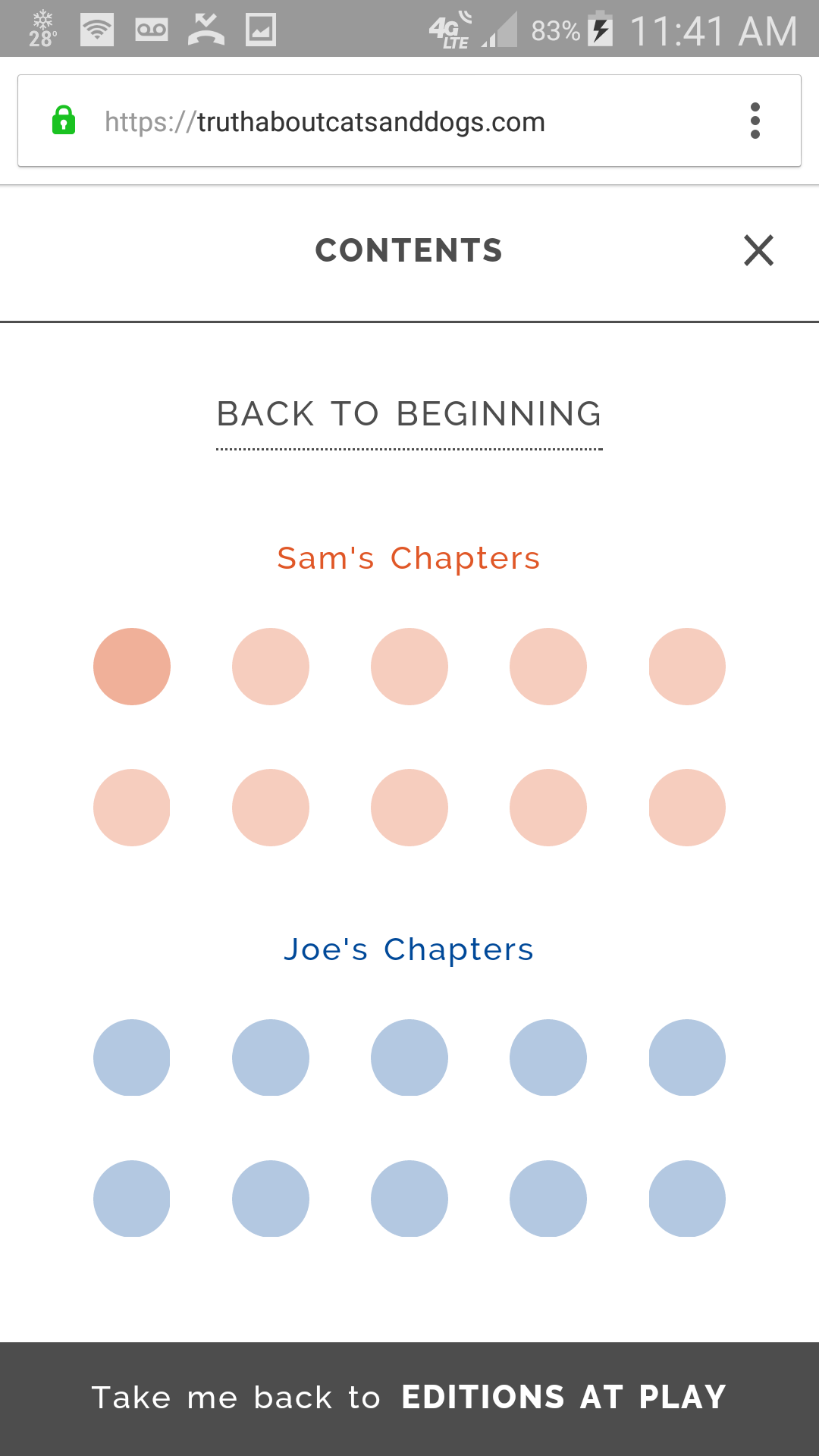 Everything E&E got right, The Truth About Cats and Dogs didn't. It's a story told in competing journals and poems, and uses the navigable nature of the platform in a way that doesn't add much. You can read the pages in any order, beginning with either character, but that seems to be the whole deal. I didn't connect with the story, enjoyed some of the poetry, but thought the “watch it get typed” gimmick was done a while back.
