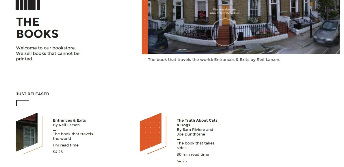 Entrances & Exits, by Reif Larsen, is a lyrical, beautiful piece of magical realism that asks the reader to navigate chapters by searching Google Earth scenes for passages. The scenes and objects make up the setting of the story, and when it works well the words and images combine in a lonely, dreamlike world. But at other points, the street scenes and clicking feel perfunctory, and that will likely be the main challenge to creating successful works: Making the technology flow, rather than breaking up the story.